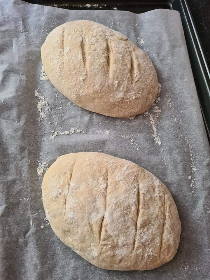 Distribute the dough on the tray, cut the top of each piece using a sharp knife and sprinkle on top some extra mix of flour.