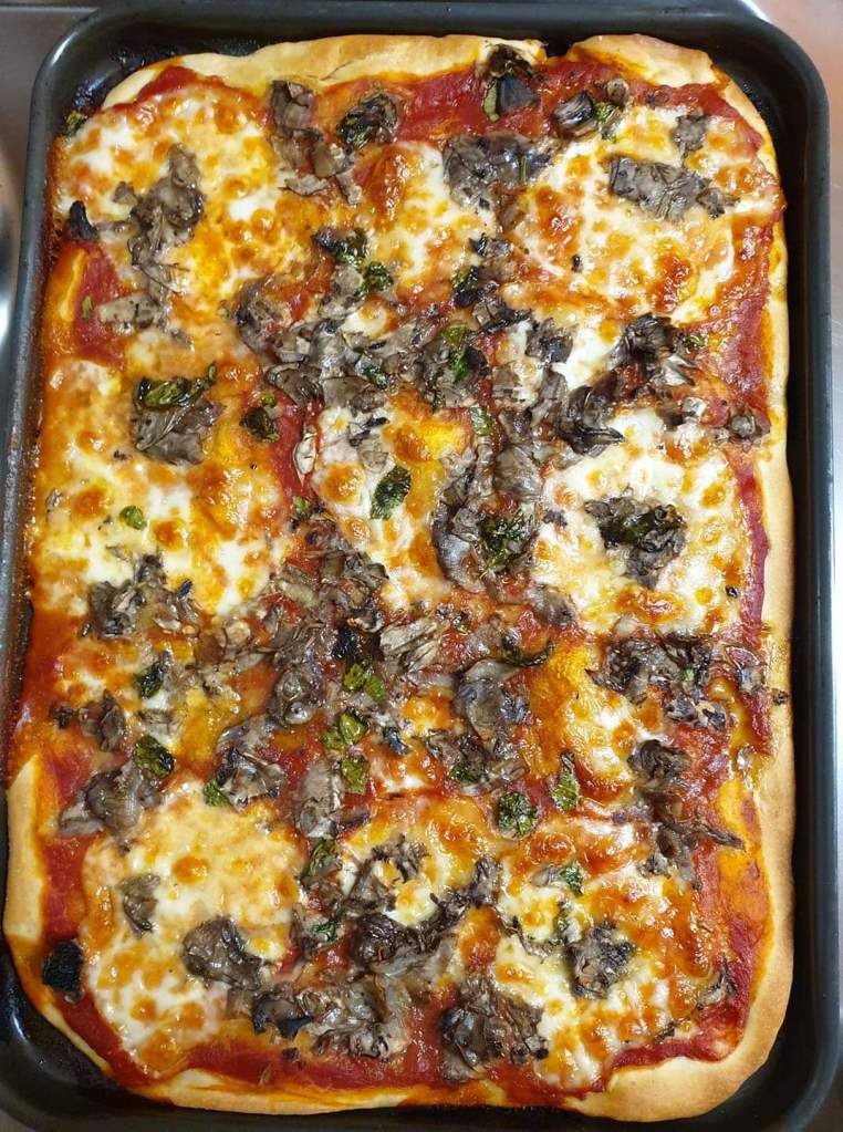 Flatten the dough until you have covered the tray fully and start dressing it with your favourite toppings.