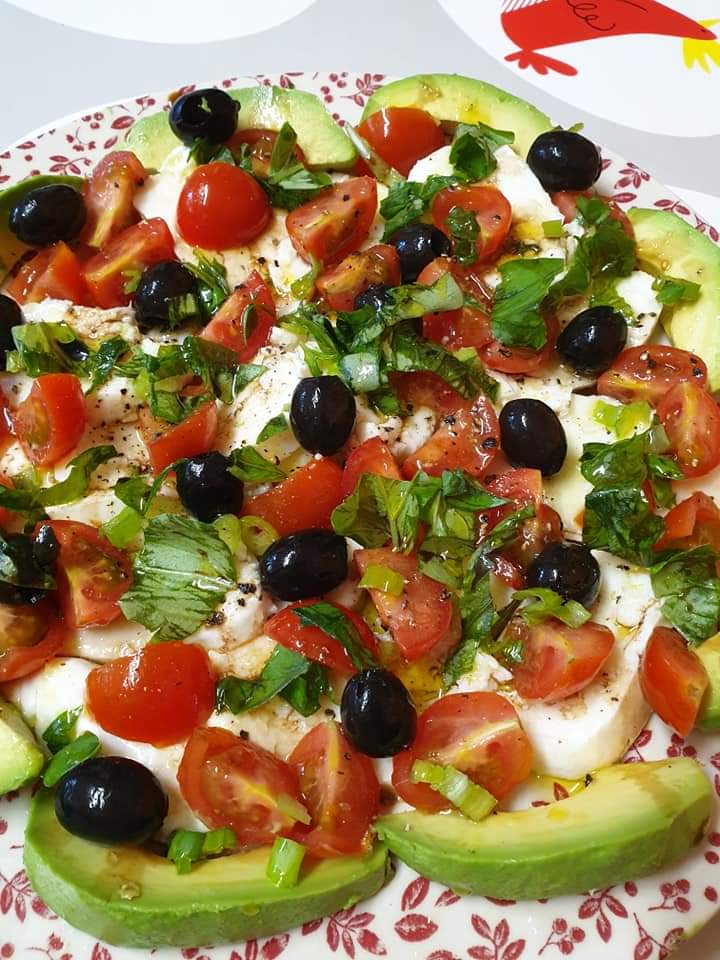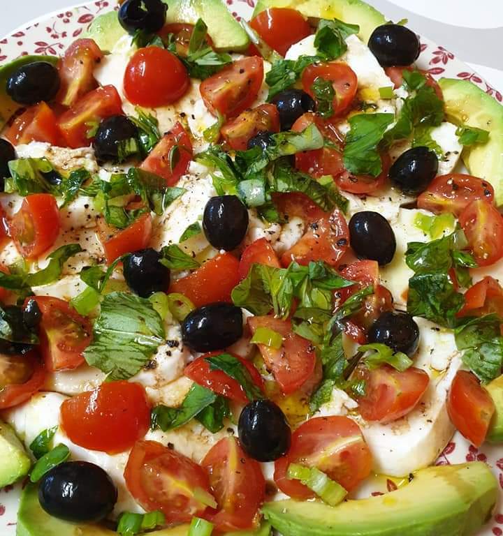 Place the avocado slices all around the plate, add the basil, season, and serve with fresh bread or rosemary focaccia.