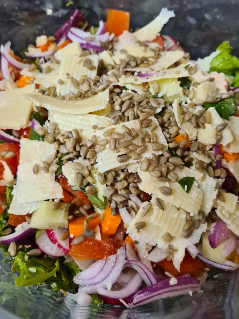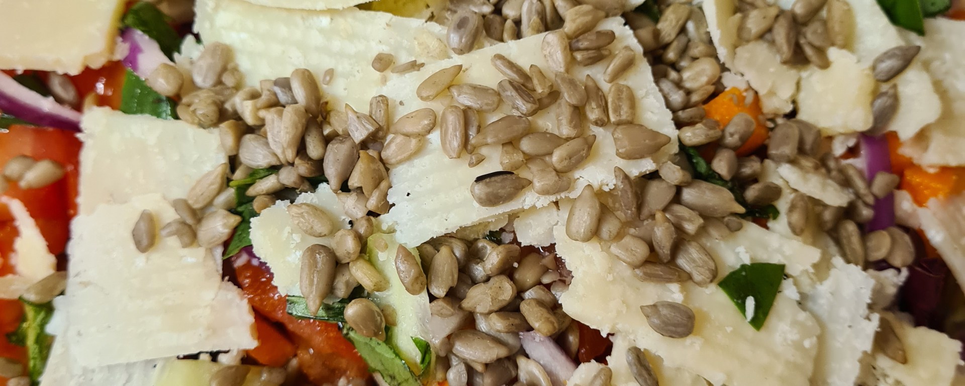 A healthy salad to accompany any second course. I like to add sunflower seeds to all types of salads, but I particularly love this one because it goes so well with the parmesan and pomegranate juice which is super healthy and tasty.