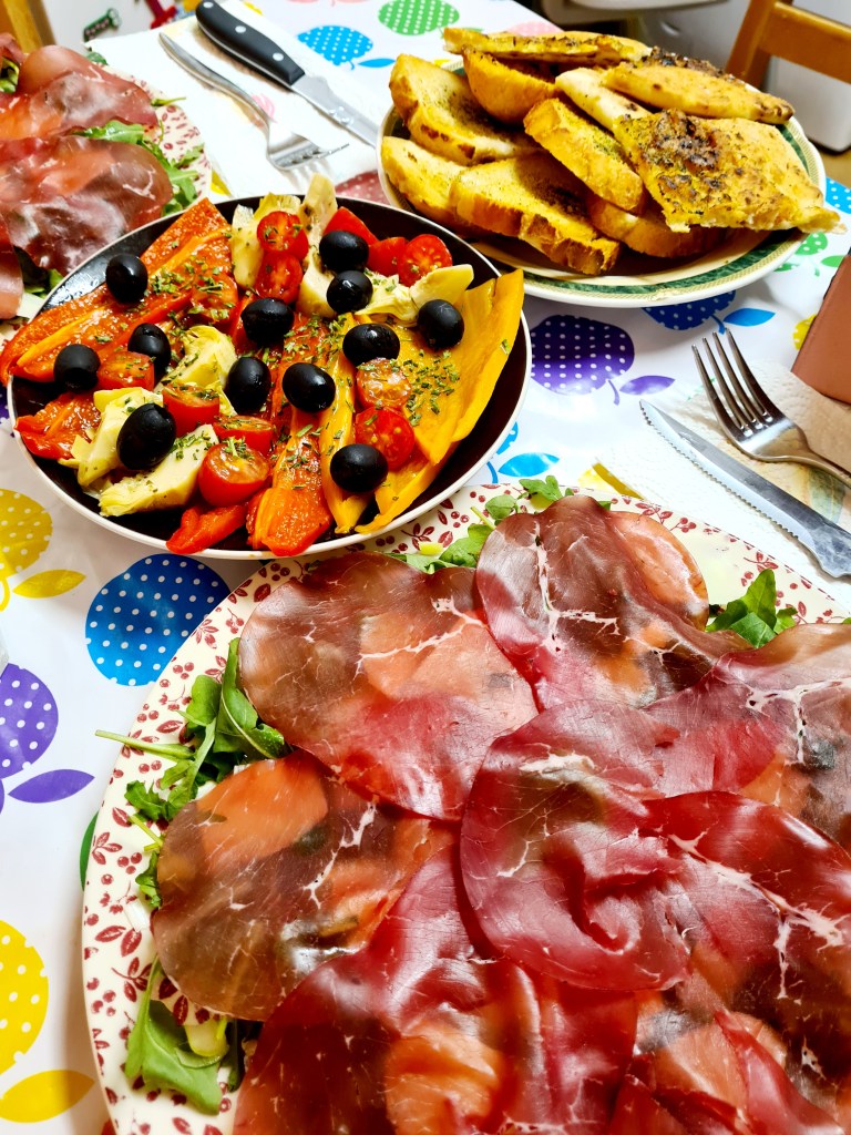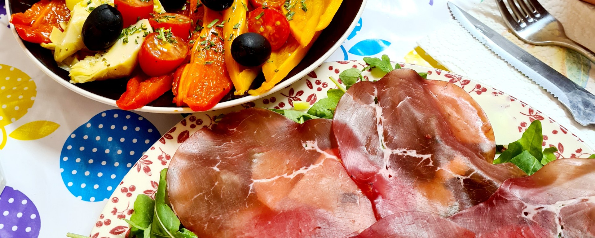 Bresaola originates from Italy’s Lombardy region and it is a versatile type of air-dried salted beef that is great in salads, pasta dishes and appetisers. It is not fatty therefore a healthier choice if you are on a diet. With many salads, I like to add a little plate of mixed colours peppers, black olives, cherry tomatoes, artichokes heart and garlic bread but it’s perfect even on its own.