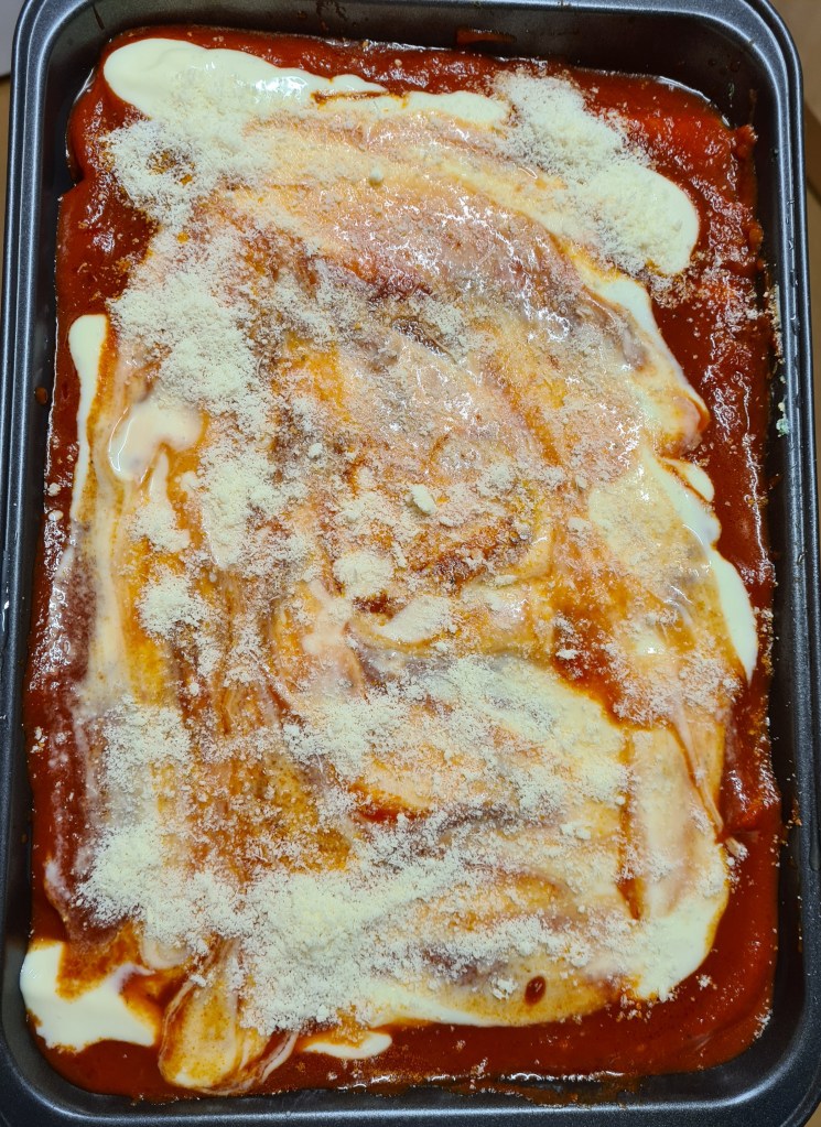 When done with the filling, cover the cannelloni with the tomato sauce, add the rest of the white sauce, the parmesan and cook for 30 minutes at 180° plus 5 minutes at 220° (we do not want to overcook the cannelloni).