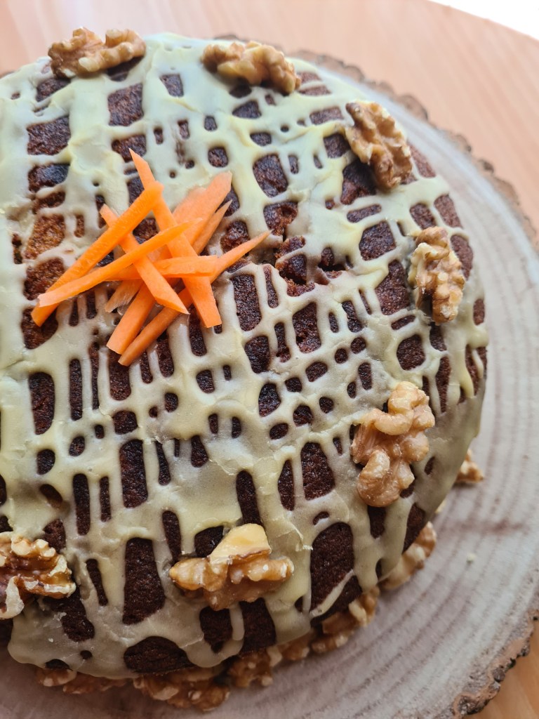 Let it cool before removing it from the mould, put it on a serving plate and decorate with icing sugar and walnuts (optional).