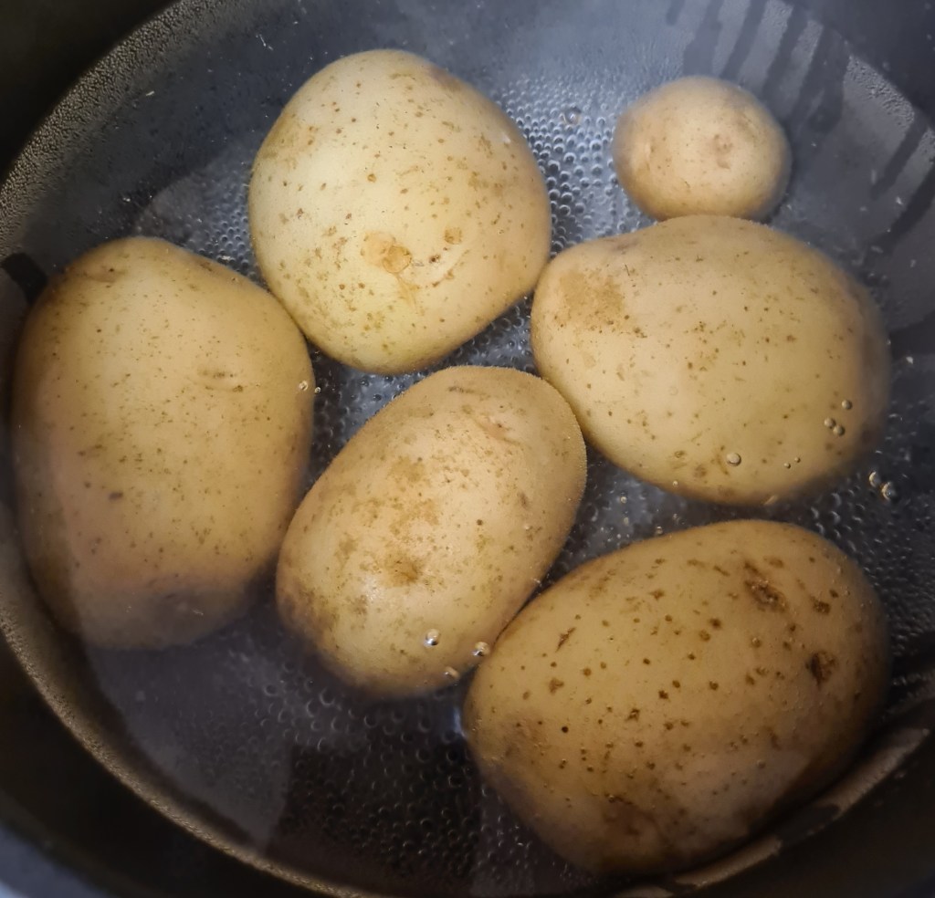 Boil the potatoes with their skin as they retain their flavour better, the pulp does not absorb too much water and most of all, it does not flake.