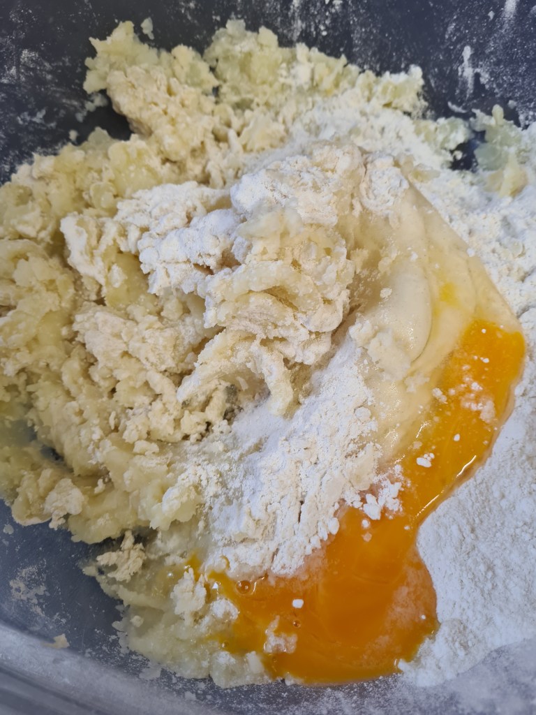 Mush the potatoes as soon as possible. Because of the starch, if they cool too much, they become sticky. On the other hand, don’t add the flour and the egg if the potatoes are too hot.