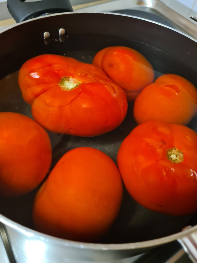 Meanwhile in a saucepan, bring to boil some water and let the tomatoes cook for less than 1 minute, after which I plunge them into a bowl of cold water. This allows the skin to peel off in no time.