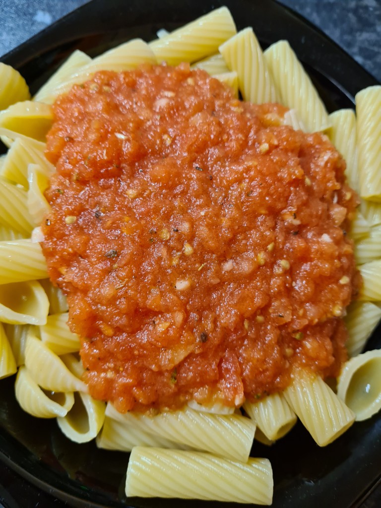 In a large pot, bring water to boil with salt and cook the tortiglioni until “al dente” (I can categorise the cooking time marked on any pack of pasta as slightly overcooked, so I never follow what’s written on it, but of course it is a question of taste).