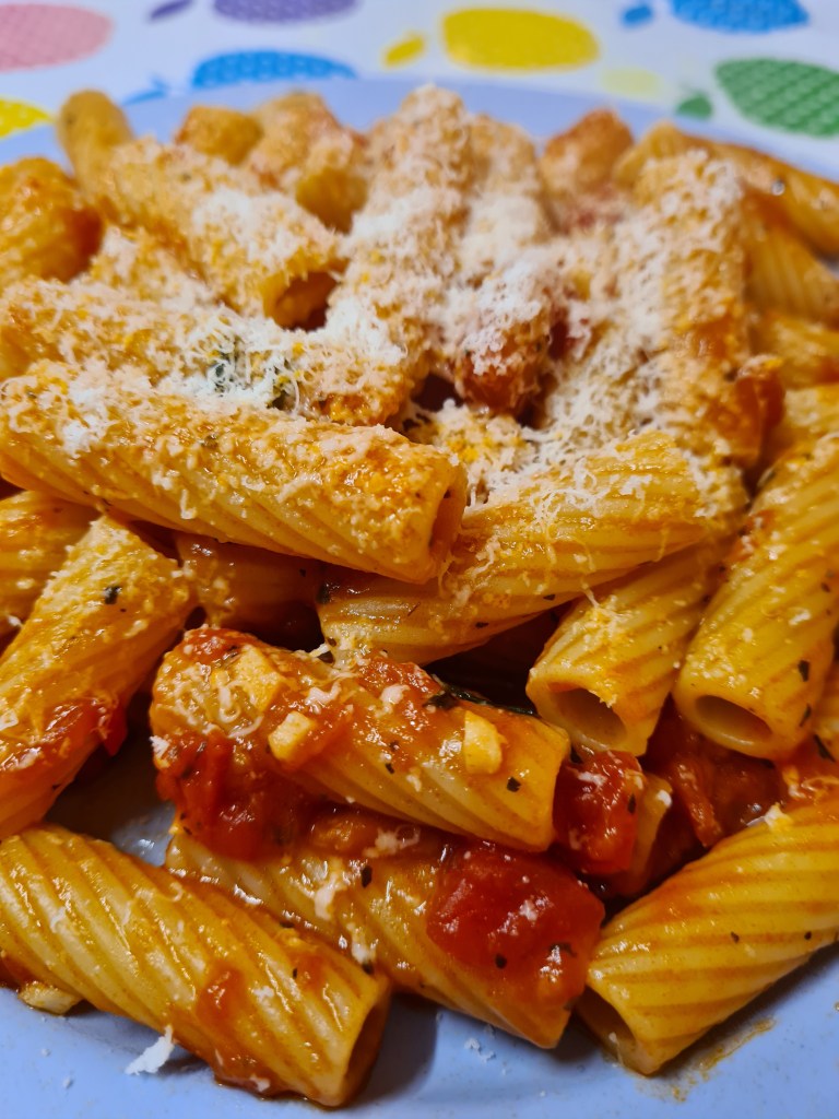 Yep, tortiglioni again. I cannot help it. I just love this type of pasta and they are perfect for this simple sauce with garlic with basil. Totally my favourite!