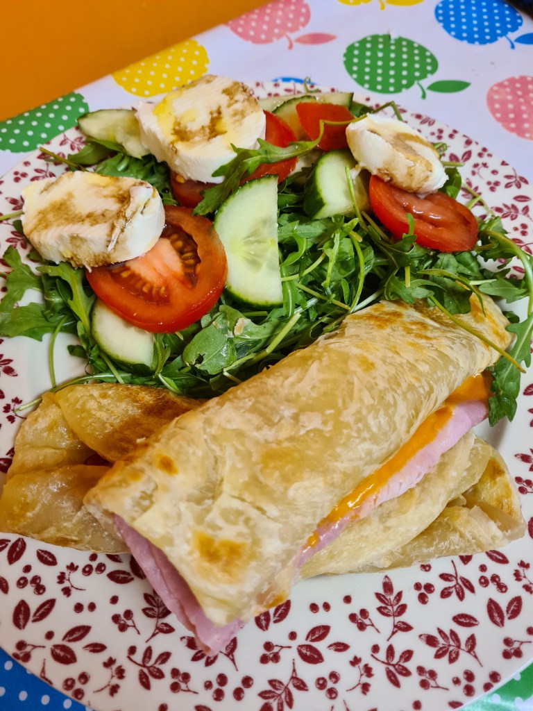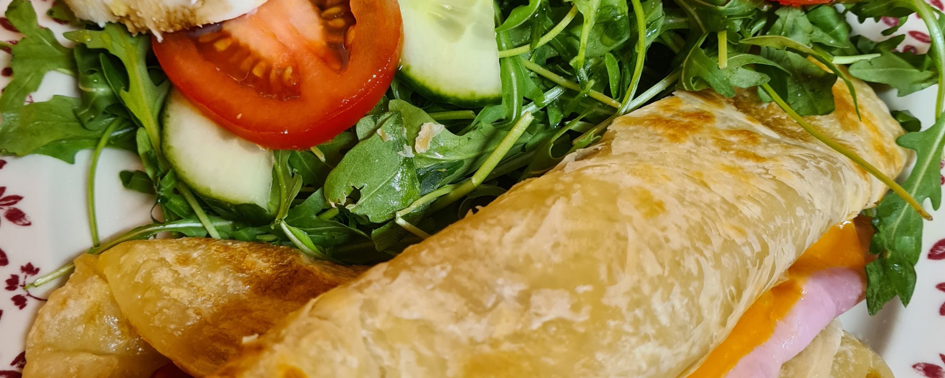 Then, on each paratha, put 1 or 2 slices of ham, and a tick slice of red Leicester.