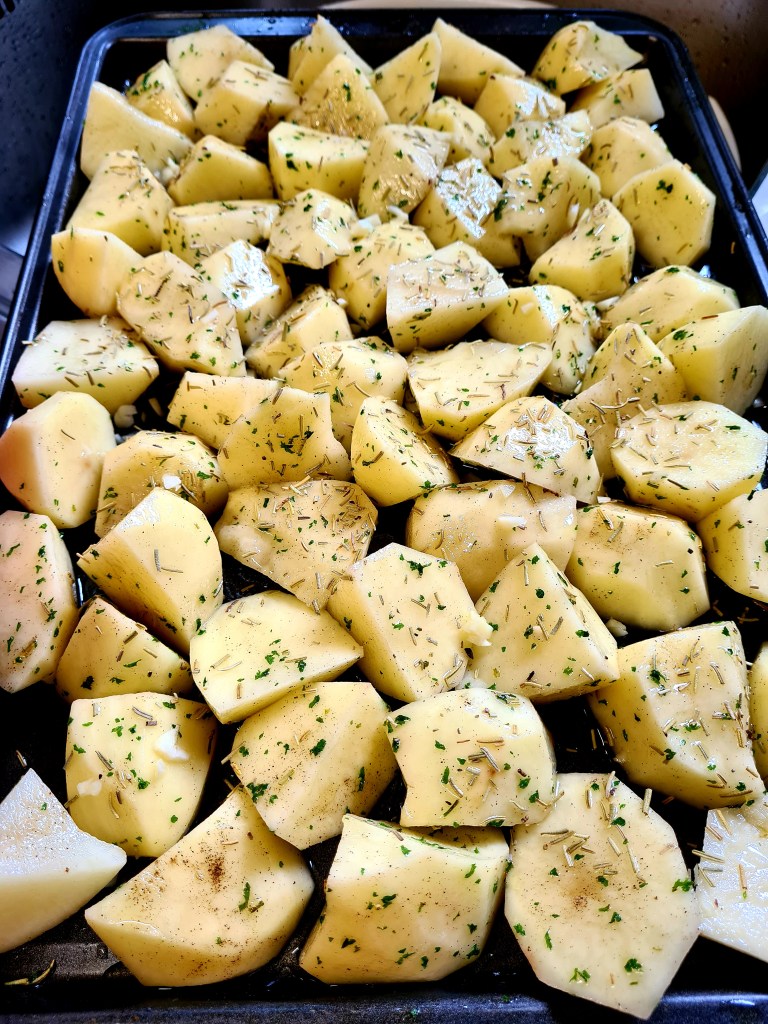 Put them in a non-stick roasting tin, add rosemary, parsley, salt, pepper and garlic.