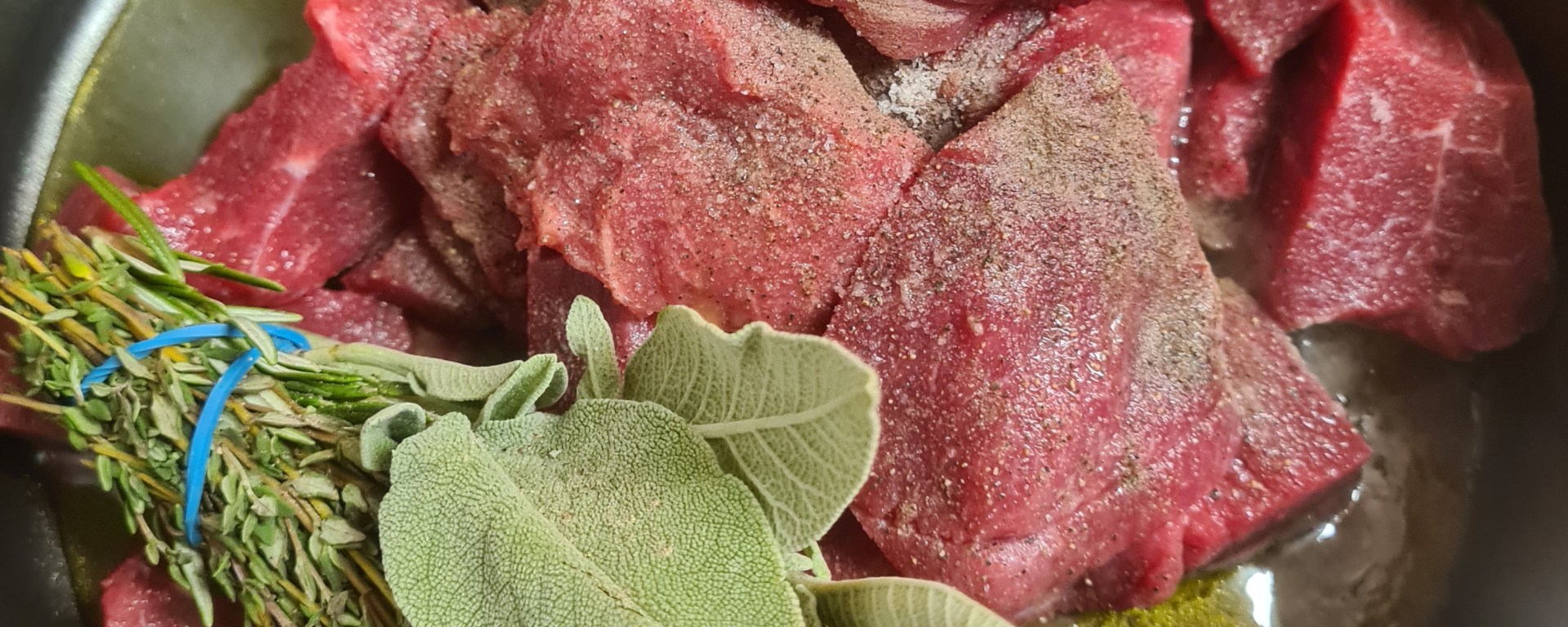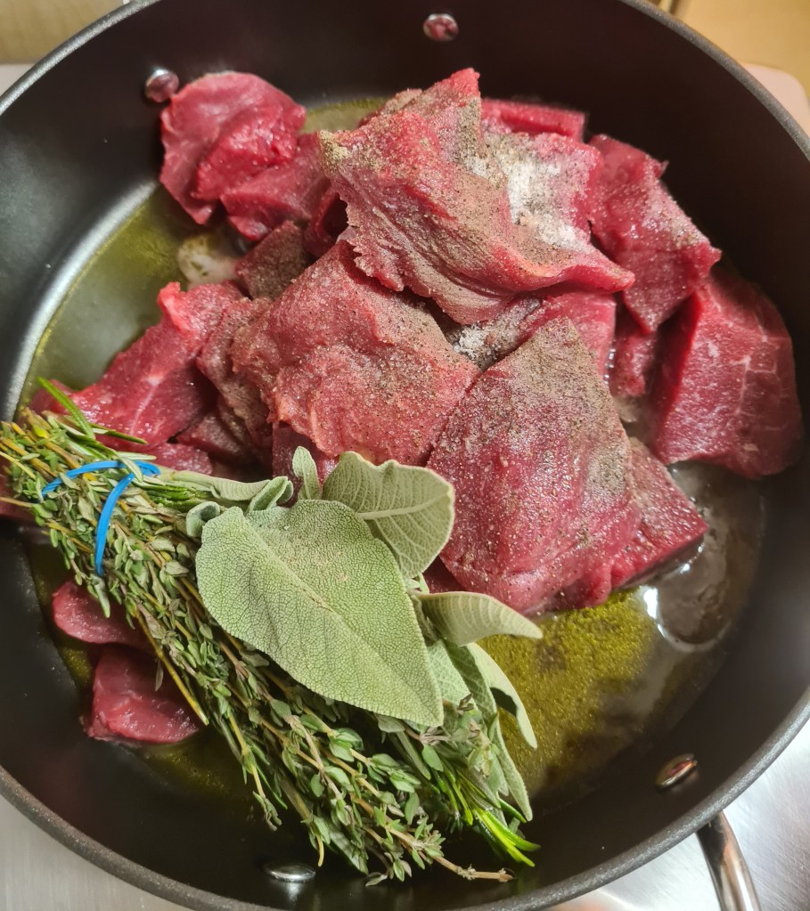 Add the meat with the herb mix, the salt and pepper, and sear it for 3 minutes or so on a medium heat until browned on the outside.