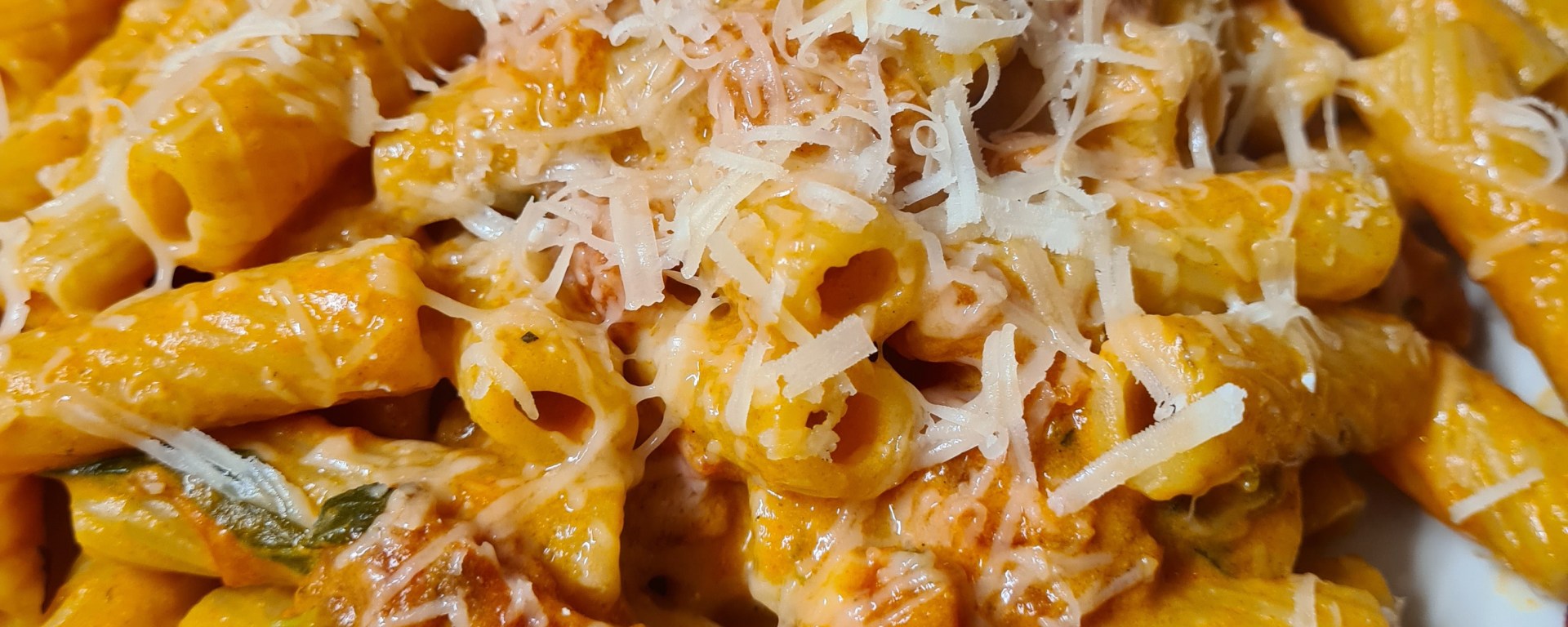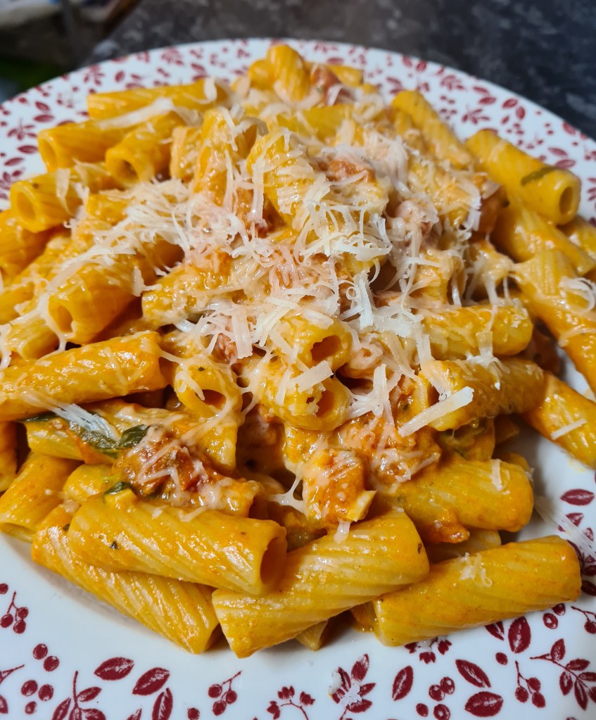 Tortiglioni will always be one of my favourite types of pasta and they are perfect for pink sauce. It is creamy and the perfect alternative to the standard tomato sauce. Your kids will love it! Instead of pasta, you could try it also with gnocchi (potato dumplings). Tip: Instead of adding just parmesan, try the mix with pecorino or get salted ricotta which is firm enough to grate and it taste delicious. Also, if you find it, try Italian cooking cream instead the standard double cream as it really makes the difference to this dish.