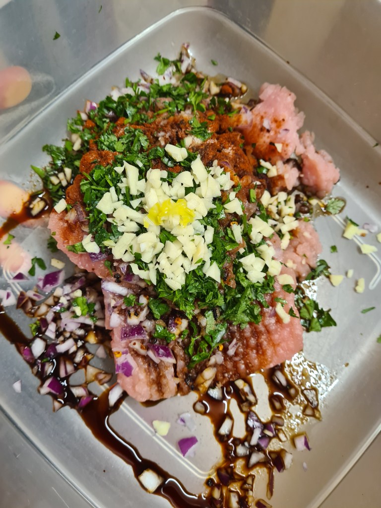 Take a bowl and mix the mince turkey with parsley, garlic, onion, soy sauce, paprika, chili flakes and salt.