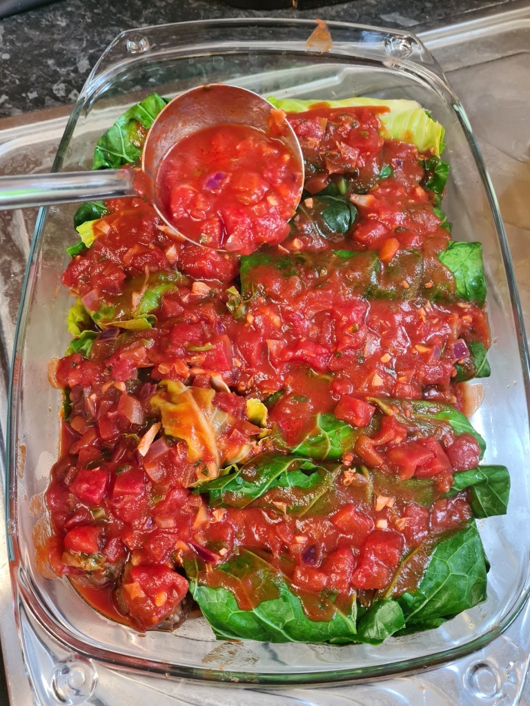 Once all the rolls are prepared, cover them with tomato sauce and cook them for about 40 minutes (to avoid overcooking the top which otherwise can become to dry, add one sheet of aluminium foil after 30 minutes or so).