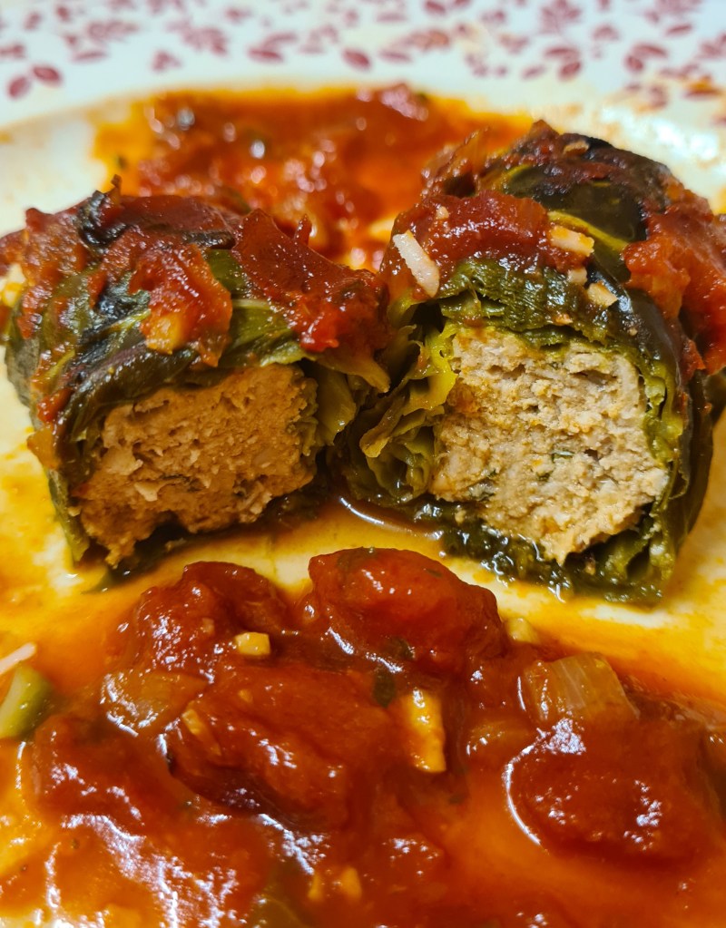 Roll the chard leaves around the meat and place each roll, seam-side down, in a large non-stick deep roasting pan where you previously covered the bottom with a little bit of tomato sauce.
