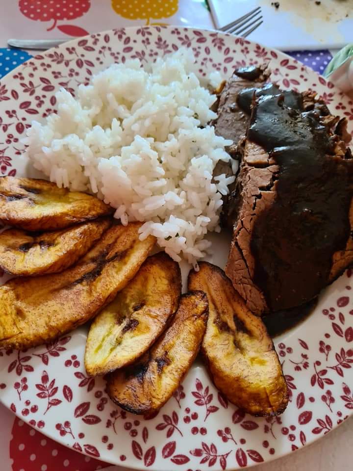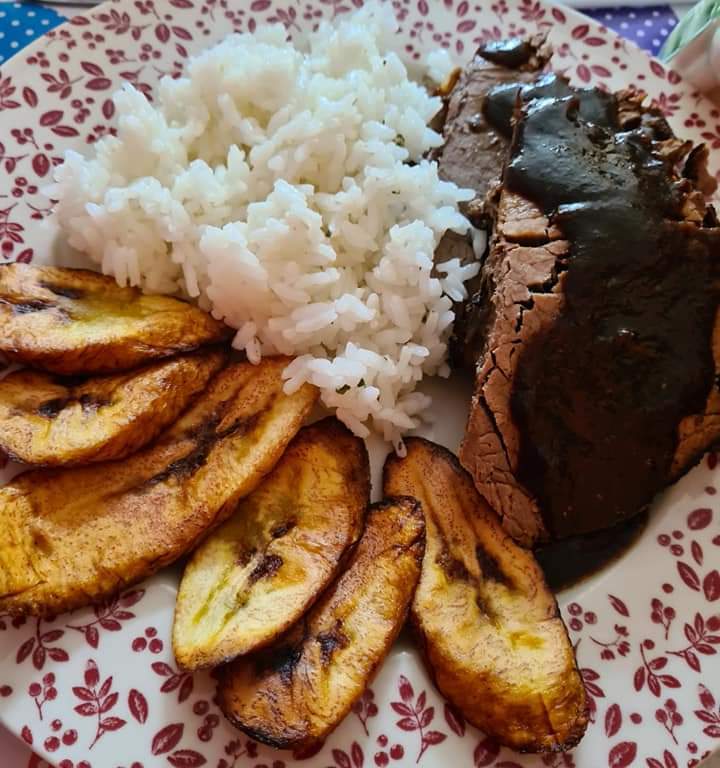 Serve the beef, rice, and plantains on a plate and enjoy!