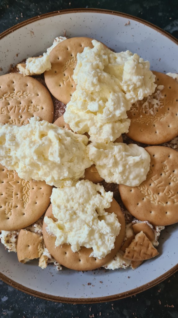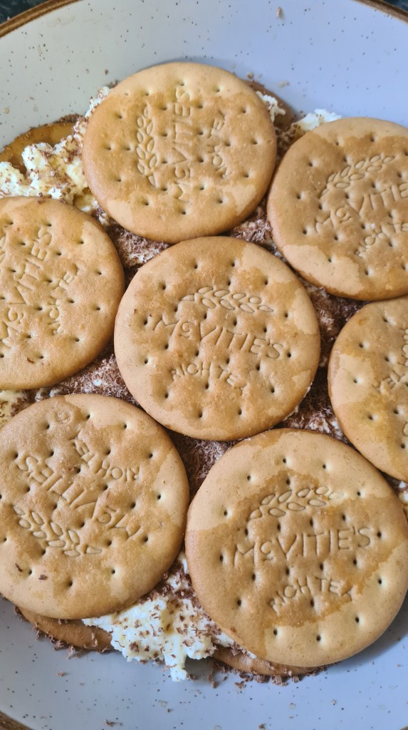 In a tray or cake dish of your choice, lay the biscuits. You can break them to cover the corners and spaces in between biscuits if necessary.