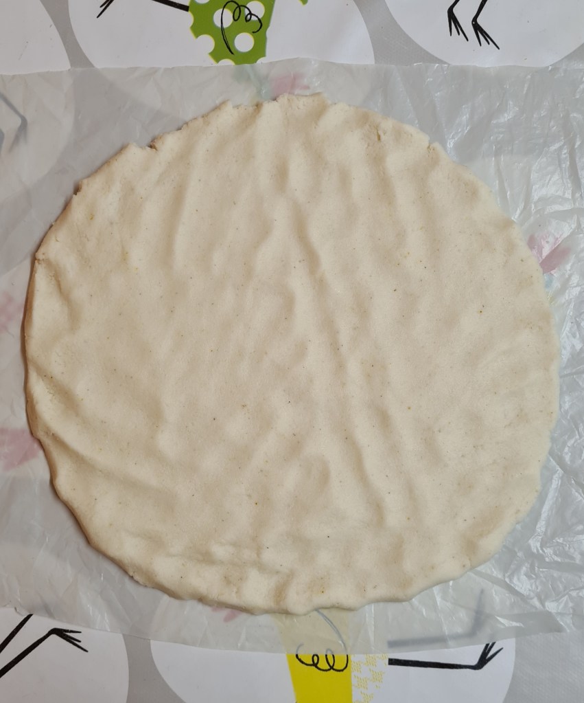 Place a large pancake pan on low heat and transfer the disc onto it (if you prefer, for convenience, you can flatten the dough directly from the pan and then you can turn on the heat).