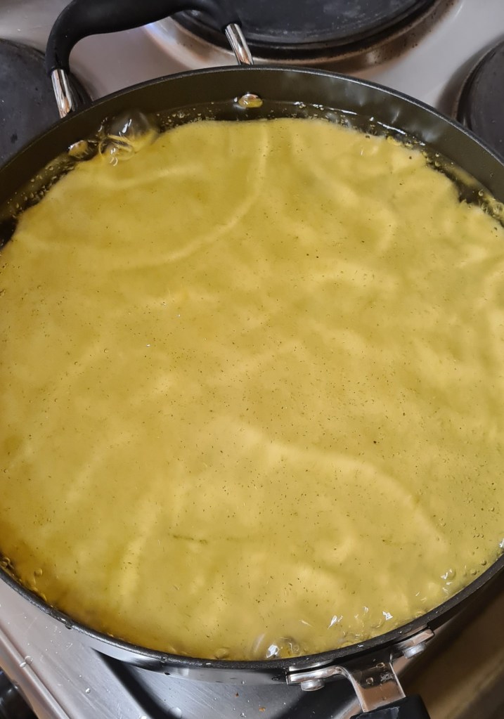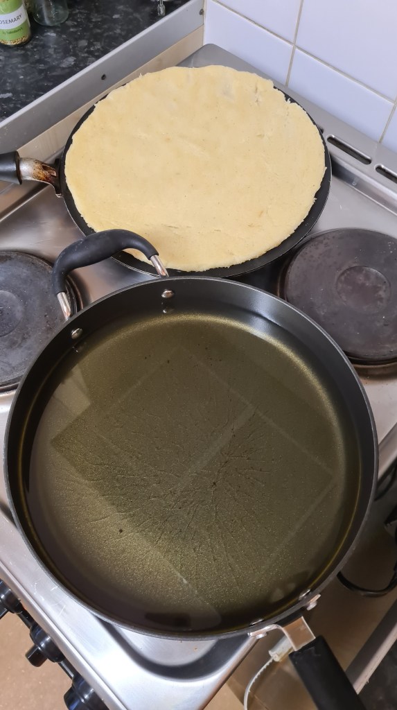 Let the dough cook for about 3 minutes or so on each side. It must reach a consistency where you can easily take the disc to place it in the frying pan without the disc falling apart or breaking.