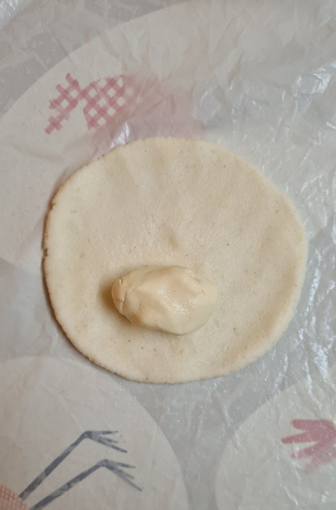 Put 2-3 tablespoons of your preferred filling right below the centre of the disc. Don’t add too much or otherwise the dough may break. Try to distribute evenly and leave at least one centimetre free on the edges to seal the empanada.