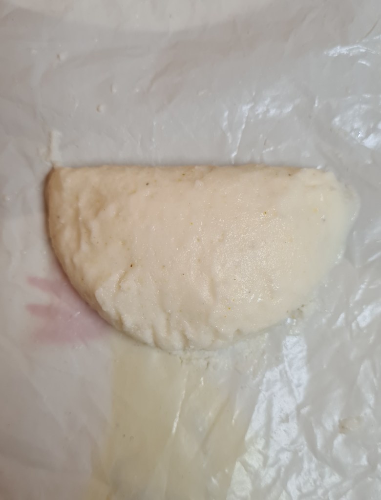 Take the clingfilm and cut it into a large square. I prefer to use a large piece of plastic bag which I keep for this recipe only. It’s thicker and I find it most suited for empanadas. Just bear in mind that the material needs to be thick enough to manipulate the dough without breaking or getting messy.