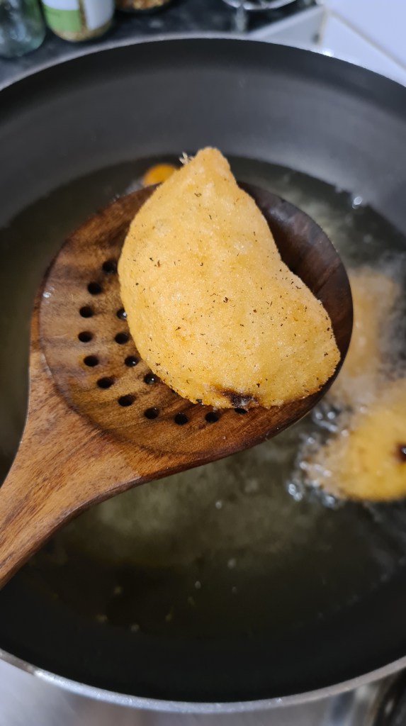 If using more than one type of filling for different empanadas, is a good idea to mark them before frying them. Otherwise, it will be difficult to tell them apart.