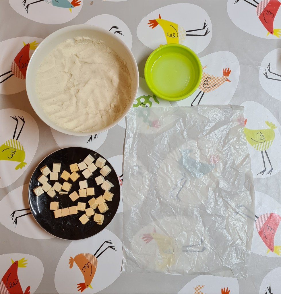 Set up your counter with the film at the centre, with the dough, fillings, and the bowl of water all next to it.